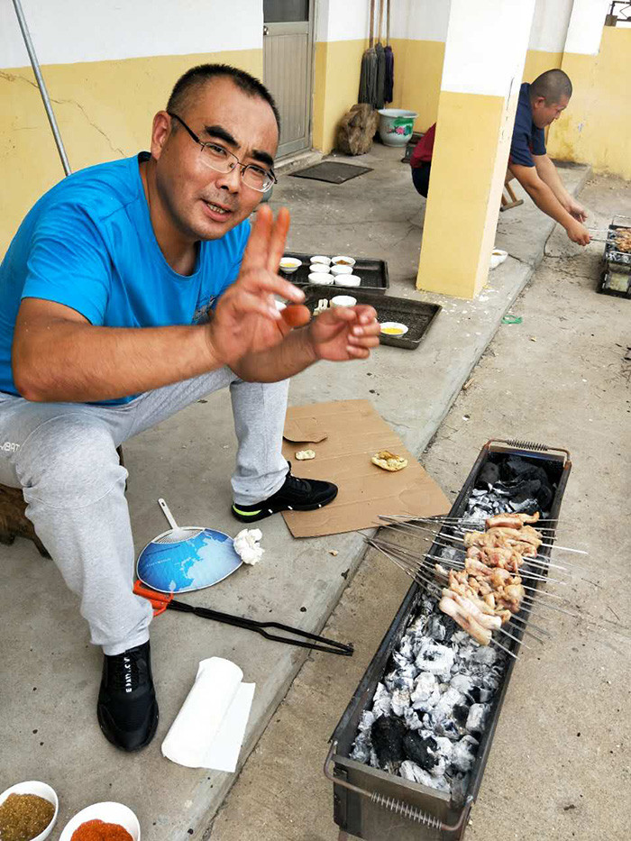 ↓这位老师傅,在等着徒弟烤好了孝敬自己,神情略微有些焦急和不满:烤的真慢……一瓶水都见底了,还没吃上肉!