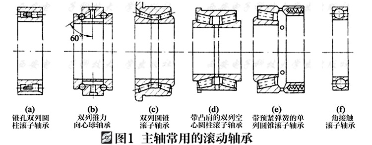 滚动轴承摩擦阻力小,可以预紧,润滑维护简单,能在一定的转速范围和载荷变动范围内稳定地工作。滚动轴承由专业化工厂生产,选购维修方便,在数控机床上被广泛采用。但与滑动轴承相比,滚动轴承的噪声大,滚动体数目有限,刚度是变化的,抗振性略差并且对转速有很大的限制。数控机床主轴组件在有可能的条件下,应尽量使用滚动轴承,特别是大多数立式主轴和主轴装在套筒内能够作轴向移动的主轴,这时滚动轴承可以用润滑脂润滑以避免漏油。图1为主轴常用的滚动轴承类型。
