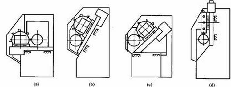 数控车床床身导轨与水平面的相对位置如图1所示,它有4种布局形式:图1(a)平床身,图1(b)斜床身,图1(c)平床身斜滑板,图1(d)为立床身。